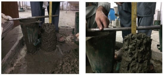 Fresh concrete was tested for workability/consistency by the slump cone test in accordance with ASTM C143 [37]. The properties of fresh concrete are listed in Table 5, and test steps are shown in Figure 6.