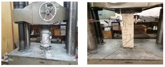Concrete specimens were tested under axial compression in a universal testing machine (UTM), having an internal high precision pressure load cell (class 1) with a load measuring capacity equal to 2000 kN. Every specimen was loaded continuously until failure with a uniform loading rate. The displacement control technique was used to operate the UTM with a loading rate equal to ~0.2 mm/min. The specimens were placed in the jaws of the UTM, and care was taken to ensure that their centerline was exactly in line with the axis of the machine. The specimens were instrumented to measure the axial strain/deformation. The compressometer was used to measure strains in concrete cylinders according to ASTM C469 [38] while the strain gauge-based displacement transducers (Kyowa DT-50A, Kyowa, Singapore) measured vertical deformations under monotonic axial concentric loading. Steel plates were provided at the top and bottom of the column to ensure uniform load distribution and to avoid any stress concentration. The experimental observation recorded the nature of failure, axial deformation, and ultimate load. The experimental setup is shown in Figure 7.