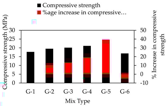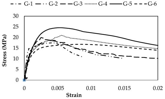 The compressive strength test results for unconfined concrete cylinders are summarized in Figure 8. It is evident from the test results that steel fibers have a pronounced effect on the strength and ductility of unconfined concrete. An increase is noted in both the strength and ductility of concrete samples. The percentage increase in strength is shown in Figure 8. The compressive strength of concrete increases from 17.64 MPa to 24.6 MPa with the addition of steel fibers from 0% to 2.5%, respectively. The highest value for strength was noted for mix G5 (2.5% steel fibers), which is 38.97% as compared to mix G1 (0% steel fibers). The results obtained in this study were correlated with the findings of previous literature [39], which deduce that the addition of steel fibers has increased the compressive strength of concrete. The increase in strength may be attributed to the bridging mechanism provided by the steel fibers. However, compressive strength may depend on other factors, such as the size, shape, aspect ratio, volume fraction, orientation and the surface characteristics of fibers, the ratio between fiber length and maximum aggregate size, the volume ratio between long and short fibers, and the concrete class [40]. Moreover, a 5.1% decrease in compressive strength was noted for the G6 (24.6 MPa) concrete mix as compared to G5 (16.8 MPa). The main reason for decreasing concrete compressive strength by increasing steel fiber may be the harshness of the concrete mix, as evident from the results reported in Table 4. It is further mentioned, that the addition of steel fibers leads to a greater surface area for the surrounding concrete which is not sufficient to develop proper bonding amongst the materials to facilitate the bridging in order to prevent micro-cracking. Literature [41] also suggested that the compressive strength of concrete decreased beyond the optimum dosage of steel fibers due to physical hindrance in obtaining a homogeneous concrete mix. It was found that by increasing the steel fibers contents, axial deformation increased from 1.8 mm to 5.36 mm (G1 to G4 concrete mixes) at the rupture point, considerably enhancing the ductility of concrete shown in Table 6, and the axial deformation is decreased from 5.36 mm to 5.04 mm (G4 to G6 concrete mixes). The stress–strain curve in Figure 9 and Table 6 shows that the G5 has the highest toughness as compared to other concrete mixes. The increase in ductility and toughness is due to the effective confinement contribution by steel fibers which prolongs the material failure. Similar findings were reported by literature [39] that steel fibers enhanced the fracture properties of concrete.