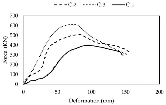 The failure pattern of RC columns with or without steel fibers showed almost similar behavior. However, the column having steel fibers (C3) showed brittle behavior and sound cracking as compared to C1 and C2 columns. With the progression of the axial load on the column specimens, spalling of the concrete cover was observed in C1 and C2, while C3 column specimens exhibit prolong spalling behavior, as shown in Figure 11. At the ultimate axial load, crushing of concrete was observed in all three columns (C1, C2, and C3) specimens with complete exposure of longitudinal reinforcement to the atmosphere in the case of the C1 and C2 columns.