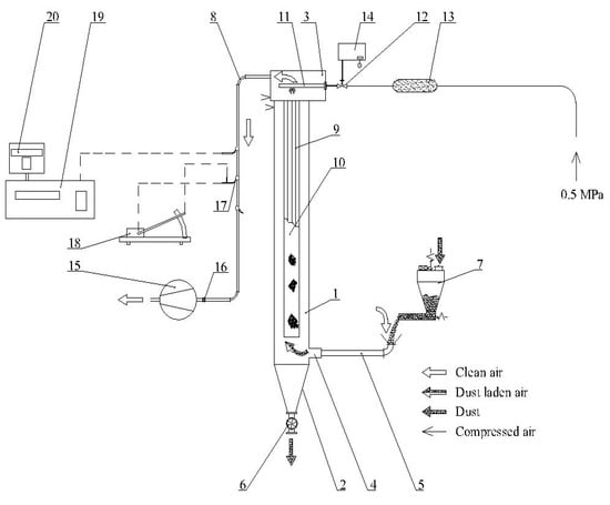 Test rig set-up: 1. filtering chamber, 2. hopper, 3. clean air chamber, 4. inlet, 5. dust inlet tube, 6. mucus feeder, 7. screw dust feeder DSK-I-04p (HYDRAPRESS, Białe Błota, Poland) 8. outflow pipe, 9. metal cage, 10. filtering bag, 11. cleaning nozzle, 12. electromagnetic valve, 13. compressed air tank, 14. The controlling device, 15. main fan, 16. gate valve, 17. Prandtl tube, 18. inclined-tube manometer type MPR-1 (ZAM Kety, Poland), 19. differential manometer type CMR-10 A (ZAM Kety, Poland), 20. printer.