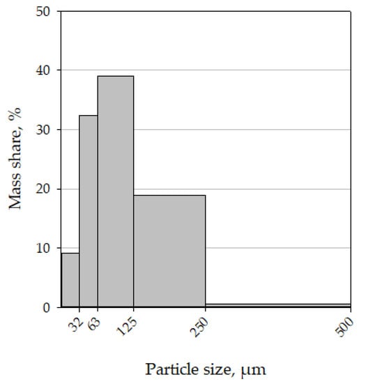 The particle-size distribution test was performed three times, and the result was aver-aged. The set of sieves used allowed for the separation of particles in size ranges from 0.00 to 0.032; from 0.032 to 0.063; from 0.063 to 0.125; from 0.125 to 0.500; and from 0.500 to 1.000 mm. The results are shown in Figure 2.