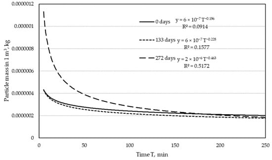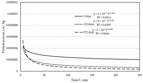 Based on the Equation (3), the mass of particles in 1 m3 of purified air was determined. The calculation of this value is necessary to determine the separation efficiency of tested materials. The results for both lines are presented in the graphs (Figure 3 and Figure 4).