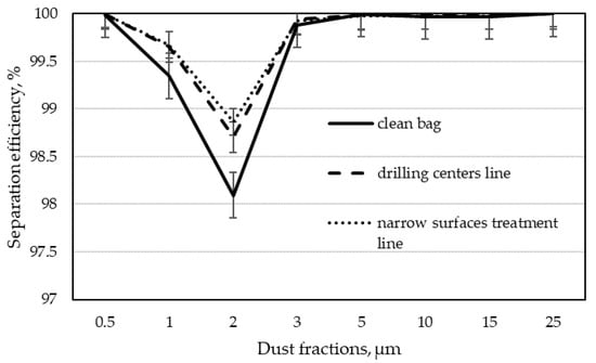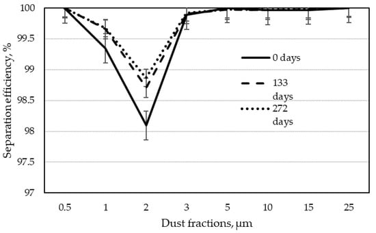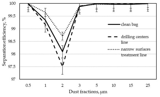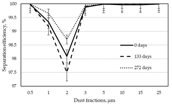 The analysis of the fractional dust separation efficiency clearly showed that for very small (0.5 and 1 µm) and large particles (over 3 µm), the efficiency reaches very high values. The least effective was for particles with a size of 2 µm.