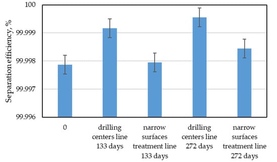 Graphs 7 and 8 show separation efficiency depending on the operation time of the non-woven fabric for individual wood dust fractions. It can be clearly seen that in the case of filter bags obtained from the narrow surfaces treatment line, the separation efficiency increases for all dust fractions with the increasing working time. The most significant increase in filtration efficiency over time was observed for the 2 µm particle size after 133 days. The separation efficiency of bags from the filter of the drilling centers line was slightly different. Here, in contrast to the filtration of dust from the narrow surfaces treatment line, the filtration efficiency for the most penetrating dust (2 µm) had the lowest values after 133 days. After 272 days of filtration, it increased, confirming the beneficial effect of filtration time on its efficiency. Such a result may indicate that the bag was mechanically damaged during operation in industrial conditions. It took a long time for the incoming dust to fill the damage and the separation efficiency for the most penetrating particles began to increase.