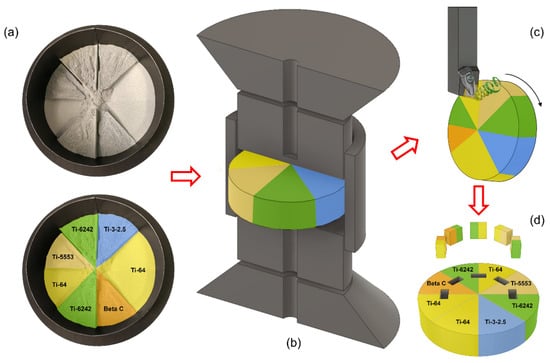 The 3D printer structure used in this work was designed to divide the inner cylindrical mould volume in eight equivalent arc sections. Figure 1a shows the powder layout after extracting the divider and the layout location of the five titanium alloys in the eight available sections. Two circular sector regions of Ti-64 were designed into the MulTi-FAST billet in opposite halves to (1) act as reference regions for the force feedback data to help map the exact location of the other alloys and (2) ensure there was no drift in force response circumferentially around the MulTi-FAST billet. As all the alloy pairings and diffusion bonds are sintered in the same solid billet under the same processing conditions, all the results are easily comparable, as the processing parameters are identical. This is a similar approach as the one used by previous researchers using the technology FAST to join dissimilar powders [18,19].