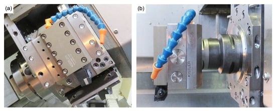 The machining trials were conducted on a WFL M100 MillTurn CNC machining centre (WFL Millturn Technologies, Linz, Austria). The machining forces were measured using a dynamometer supporting the tool holder and connected to the machine arm. The dynamometer plate used for this study is a Kistler 9129AA (Kistler, Winterthur, Switzerland) containing eight piezoelectric sensors that measure the forces in the three spatial axes. This is a direct measurement of the machining forces, with a direct correlation of the forces exerted into the tool with the voltage signal provided by the piezoelectric sensors. These signals are collected through the multi-channel charge amplifier (Kistler Type 5070, Kistler, Winterthur, Switzerland) and the Data Acquisition system (Kistler DAQ Type 5697A1, Kistler, Winterthur, Switzerland) and saved via Kistler’s Dynoware software V3.1.0.0. (Dynoware, Winterthur, Switzerland). The dynamometer installed in the CNC machining centre with the tool holder and insert before connecting the umbilical cable is shown in Figure 2. The tool inserts selected for this study were CNMG 12 04 08 SM 1115 manufactured by Sandvik (Stockholm, Sweden), which have a tool radius of 0.8 mm.