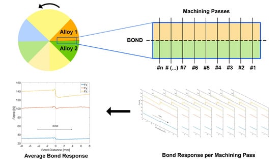 Due to the nature of the face-turning operation and the orientation of the diffusion bonds, each bond is traversed by the tool once per rotation. This means that it is possible to calculate the average response of the machining forces (per rotation) to evaluate the behaviour of the machining forces across the bond. These values were calculated from a sub-dataset comprising a geometric region 16 mm wide, with the bond in the centre. The individual bond force response in the three axis was then calculated as a function of the bond distance per machining pass across the bond and then averaged. This ensures that the machining effects, when the tool insert crosses the bond, displayed in such plots are consistent and unaffected by individual events, such as vibrations and chatter. A graphical representation of how these datasets were extracted is shown in Figure 3.