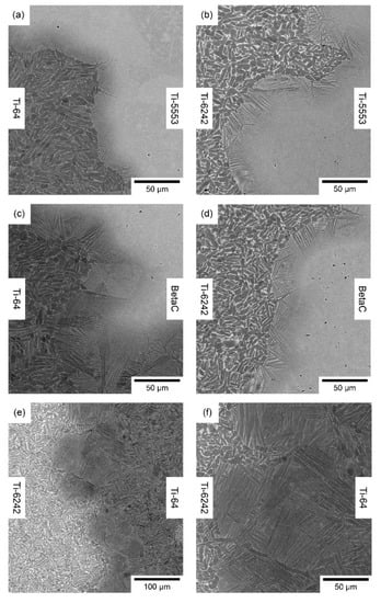 Backscatter electron micrographs of a range of titanium alloy diffusion bond pairings from the MulTi-FAST billet, processed at 970 °C and for a dwell time of 25 min. (a) Ti-64/Ti-5553, (b) Ti-6242/Ti-5553, (c) Ti-64/Beta C, (d) Ti-6242/Beta C, (e) Ti-6242/Ti-64 at low magnification and (f) Ti-6242/Ti-64 at high magnification.