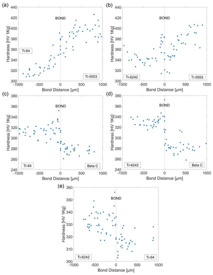 In the two bond pairings where Ti-5553 is present (i.e., Ti-64/Ti-5553 and Ti-6242/Ti-5553), the level of hardness values across the bond is smoother compared to the other alloy pairings, with no abrupt changes in the measured hardness values. The hardness levels in the bond transition region are within the limits defined by the bulk hardness of both materials. The high strength Ti-5553 also presents the highest hardness values of all the alloys analysed, with a maximum hardness value of ~420 HV.