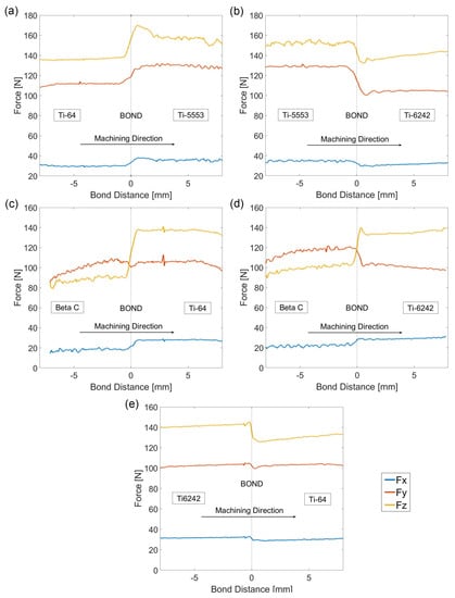 Plots presenting the average machining forces across the diffusion bonds response for Fx, Fy and Fz. (a) Ti-64/Ti-5553, (b) Ti-6242/Ti5553, (c) Ti-64/Beta C, (d) Ti-6242/Beta C and (e) Ti-6242/Ti-64.