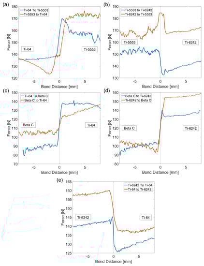 In the case of the Ti-5553/Ti-64 bond pairing, when the tool traversed from Ti-64 into the Ti-5553, a sharp increase in force was observed immediately after crossing the bond in the Ti-5553 region. This peak force was an absolute maximum, registering a value of ~170 N, greater than the average bulk Fz value for both alloys. However, when the direction was reversed (i.e., from Ti-5553 to Ti-64), a sudden drop in force was registered in the Ti-64 region immediately after traversing the bond.