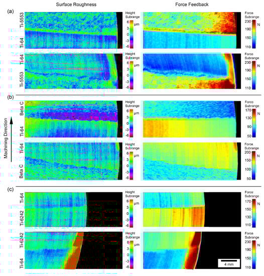 In previous investigations, it has been observed that there are multiple factors affecting the machined surface quality of titanium alloy components in machining operations, such as tool shape, geometry and tool wear, temperature, tool coating, feed rate, cutting speed, depth-of-cut and BUE formation [57]. Some of the parameters such as tool geometry, tool coating and tool wear can be discarded as an influencing factor, because the two alloys were machined with the same tool during the same machining operation. The rest of the parameters cannot be discarded because there is not enough data or the data is difficult to measure while processing. For example, the feed rate, cutting speed and depth of cut should be the same for both alloys, but the machinability of α + β alloy and metastable β alloys is different. Hence, it is possible that the Numerical Control (NC) of the equipment used, had to adjust the settings in real-time to maintain the same selected cutting parameters. If the tool decreases the speed during the initial stages of metastable β alloy machining, it could take a fraction of a second for the machine to increase the power to maintain the same speed. In that fraction of second, as the machine is adjusting its settings, the speed decreases and both the pick-up and reaction forces increase. All this relates well with the observations from the Alicona and force feedback maps, as well as the pickup generated in Figure 8. However, this will not be possible to demonstrate without being able to obtain the data of the actual speed of the machine.