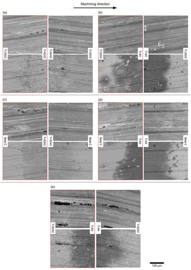 Overall, there is always damage when machining from the metastable β to the α + β alloys (micrographs inside the red box). This damage is shown clearly in Figure 9a–d, where there is a combination of pick-up (which is re-deposited built-up edge material from tool cutting edge) in the exact location of the bond as well as a distinctive change in surface topography (valley formation). However, this damage is not observed in Figure 9e where the bond is composed of two similar alloys. When machining from the α + β to the metastable β alloys, there is no specific damage observed in any of the bond pairings.