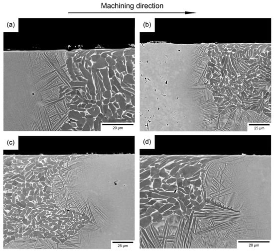 The surface finish, when machining from Ti-5553 to Ti-64, presents clear pick-up features at the bond region (Figure 9). However, when machining from Ti-64 to Ti-5553, there is no evidence of surface damage adjacent to the bond, apart from pick-up located randomly on the surface. This result does not correlate well with Figure 7 and Figure 8 where a peak at the surface and a peak of force was observed at the bond region. The challenge with the topographical map and the force feedback data is that it is difficult to pinpoint the exact location of the bond. From Figure 11, the increase in the surface finish does not occur in the bond: it occurs at approximately 200–300 μm from the bond line, as depicted by the yellow boxes. This distance is greater than the expected diffusion distance from the bond for a subtransus microstructure [19]. The Z-contrast brightness of the pick-up in the backscattered electron micrographs in Figure 11 shows that it is not exclusively from the Ti-64, as it consists of traces from the metastable β alloy also. It is a possibility that changing alloy chemistry, and hence changing the reaction between the tool and workpiece material (and propensity for built-up edge (BUE)), results in an abrupt “cleaning” of the tool tip through the scraping of the BUE from the cutting edge onto the machined surface, possibly reducing the integrity of the component in such locations [43].