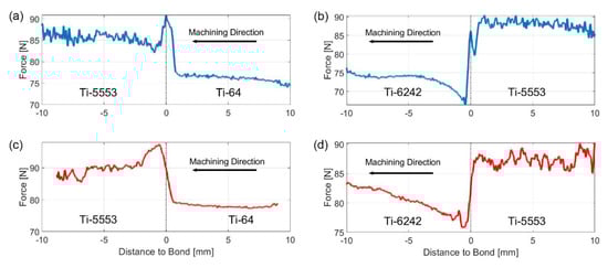 Similar behaviour was observed in the Ti-5553/Ti-6242 bond pairing: an increase in the force and a force plateau appears at the interface region when the tool travels from Ti-6242 into the Ti-5553. However, when the machining direction is reversed, a sudden drop in force appears in the Ti-6242 region, after crossing the bond.