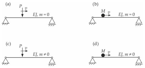 The literature on the dynamics of beams under moving loads is extremely extensive. Traditionally, authors have investigated four types of problems related to inertial and non-inertial moving loads [3] (Figure 1). The first studies assumed that the entire mass of the beam was concentrated in the beam mid-span or was completely neglected (Stokes’ problem). In 1905, Kriloff [4] solved the problem of a simply supported beam with a distributed mass under force moving at a constant speed. In 1934, an extensive work by Inglis [5] was published, in which a particle moving along a simply supported beam was considered. After this period, various studies observed that the moving load model is complex. It can be, for example, a one- or a two-mass oscillator with or without damping, e.g., [6,7].