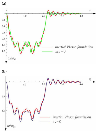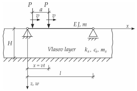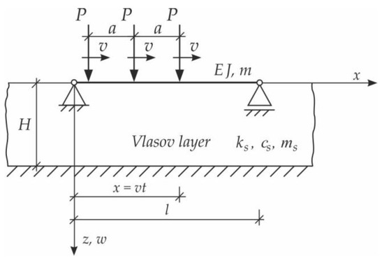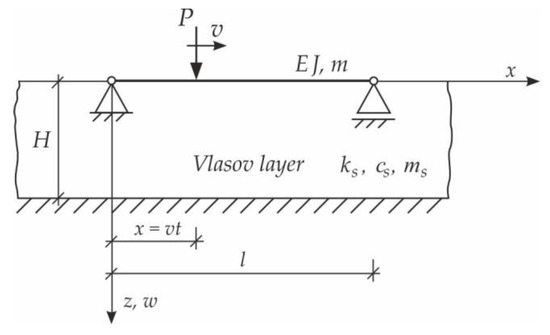 Basic models can be used for the initial verification of calculations of complex structures by the finite element method using large computer systems. In [3], it was shown that the critical forces causing the buckling of the beam on the foundation, as well as the critical speed, not only depend on the weight of the beam but also on the mass of the moving load, the mass of the co-vibrating ground, and the shear coefficient of the soil. The model which takes into account these factors is the three-parameter (modified) Vlasov model [19]. In addition, the adoption of the Vlasov foundation three-parameter model of the inertial, deformable foundation allows examination of the impact of subgrade settlements deep into the foundation layer and in the beam vicinity.