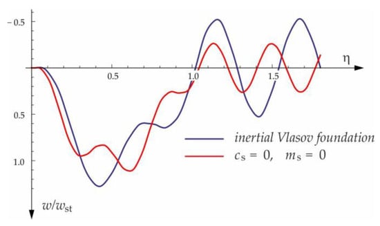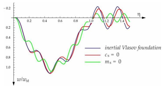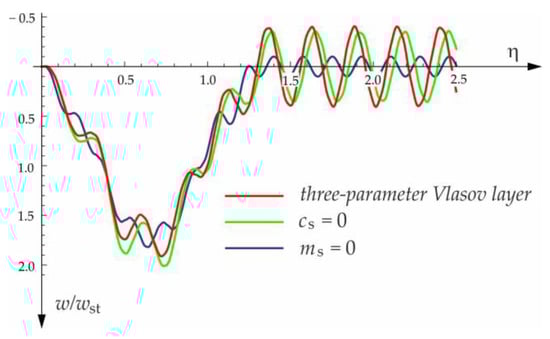 The function (5), which decreases deep into the layer and the foundation coefficients, depends on the dimensionless parameter . In turn, the parameter depends on the thickness of the layer, the Poisson number, and the deflection of the beam and the derivative of this deflection. In order to solve a specific problem in the statics or dynamics of beams on the modified Vlasov foundation, iterative procedures should be used or the foundation parameters should be determined using the method proposed by Ting [40].