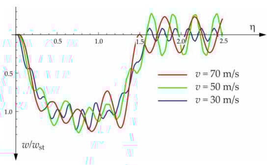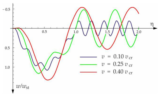 Equation (17) is valid when the moving force is on the beam, i.e., for , and is valid at the load velocity . The critical velocity can be easily determined by the assumption that the denominator in the trigonometric series (Equation (17)) is equal to zero: