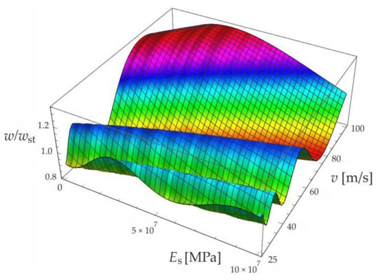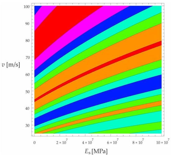 Effect of moving force velocity and a foundation’s Young’s modulus on the deflection of the midpoint of a simply supported beam under forced vibration—contour map corresponding to the diagram in Figure 7.