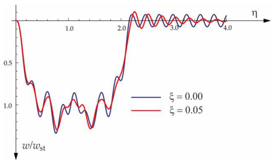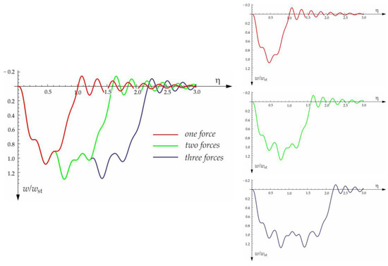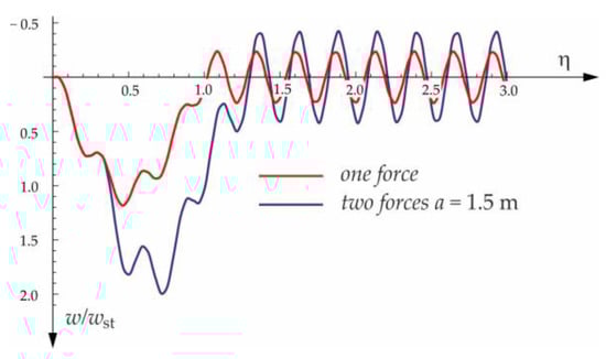 The free vibration of the beam can be found in the same way as the beam under a single force (see Section 3.1). Solutions for forced and free vibrations of the beam under a group of three forces are presented graphically in Figure 15, Figure 16, Figure 17 and Figure 18. As before, the dimensionless coefficient is introduced into the calculations. In the diagrams, deflection is referred to the static displacement of the beam’s midpoint under the action of one force. Calculations are provided for the same assumptions concerning the dimensions and mechanical properties of the beam and the soil layer, as presented in Section 3.1 and Section 3.2.