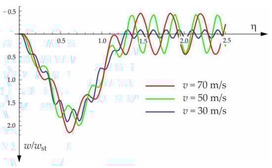 The presented solutions and numerical examples concern speeds lower than the critical velocity. A dimensionless coefficient was introduced into the calculations. In the diagrams, deflection referred to the static displacement of the beam’s midpoint .