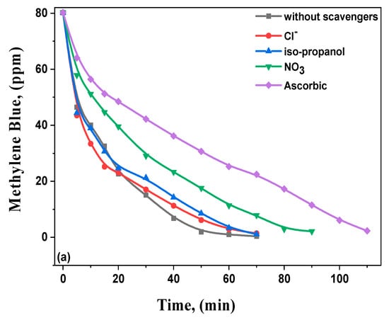The photogenerated holes can react and emit chlorine radicals with the chloride anion, which can respond and form radicals of dichloride anions (Cl2) [61]. To produce chlorine and chloride-free anions, two radicals of dichloride anion can efficiently react with each other. To generate radicals of chloro and hydroxyl, the reaction between radicals of dichloride anion and water molecules is also accomplished to get ClOH•−. Chloride has been referred to as a scavenger of OH radicals. IPA can also scavenge a moderately slower rate of .H radicals than OH radicals. OH can be effectively captured by nitrate ions, while •H and photogenerated electrons can be scavenged to a lesser degree [59]. Ascorbic acid (H2A) showed the most extreme decline in MB and Ph degradation as an O2− scavenger. The reaction between H2A and superoxide radicals could be completed under acidic environments to create ascorbate radicals and H2O2 with a second-order response. The resulting ascorbate was a relatively non-reactive reaction that decomposed into H2A and dehydroascorbic acid through a disproportionate reaction [75].