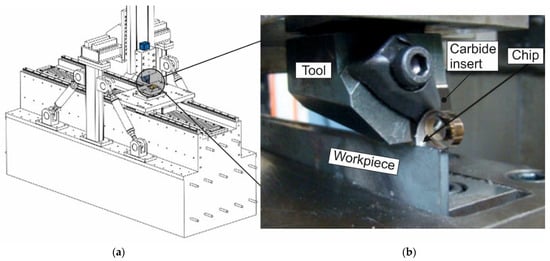 The CAD model of the experimental stand is shown in Figure 1a. The bed of the test stand is manufactured from solid polymer concrete. On the bed, there are slideways for moving the table with the workpiece. To measure the cutting forces on the workpiece side, it was clamped in a three-component dynamometer type 9121 from Kistler, which is located on the table. The linear motor provides the reciprocating motion of the table. The table movement speed with the workpiece is continuously adjustable from 0 to 200 m/min. This covers the conventional cutting speed range for most metals and alloys. The drive system consists of a linear motor, a servo control unit, including power electronics, and a computer as the control system.