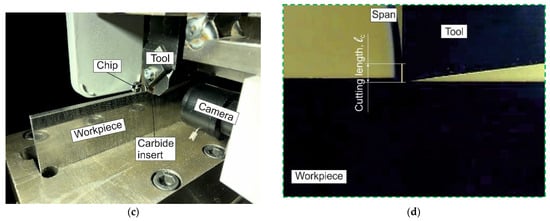 Measurements of the contact length between the tool rake face and the chip were performed on a special experimental stand that realizes the process of orthogonal and oblique cutting—Figure 1 [59,60].