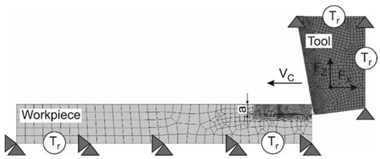 The boundary conditions were determined by fixing the workpiece and the tool as well as by the input of the thermal conditions at the boundaries of the respective objects. The bottom of the workpiece was rigidly fixed in the X- and Y-directions. The thermal initial conditions at room temperature Tr were given at the bottom and the lefthand side of the workpiece as well as at the righthand side and the top of the tool. The working motion of the tool at a cutting speed VC for guaranteeing the cutting process was given by the absolute motion in the negative X-direction. The depth of cut (undeformed chip thickness) was determined by the value a.