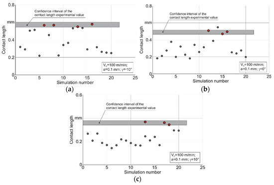 Thus, for each value of the tool rake angle considered in this study, there is some set of constitutive equation parameters that provides a numerically simulated contact length approximately corresponding to its experimental value. The generalized values of the constitutive equation parameters satisfying all the studied values of the tool rake angles may be determined by finding the intersection of the pluralities of the parameters defined as a result of the second iteration (see Figure 6). Naturally, these generalized values can be defined only if the plurality intersection is not empty. In the case of an empty plurality, the algorithm for determining the generalized parameters of the constitutive equation should provide for the redefining of the parameter limits for subsequent iterations and possibly the increasing of the number of simulations. A similar methodology for finding the multiple plurality intersections of the constitutive equation parameters can also be applied to any cutting characteristic or to a combination of several cutting characteristics obtained by the convolution product of individual characteristics.