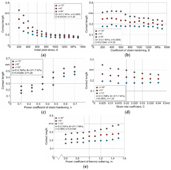 When the individual parameters of the constitutive equation change within the wide ranges of their values, the initial yield stress A, the power factor of stress hardening n, and the power factor of thermal softening m have a clear influence on the contact length. With the increasing A value, the contact length monotonically decreases, approaching a minimum constant value (see Figure 5a). In this case, the A values that provide the contact lengths corresponding to their experimental values are in the range of 300 MPa to 600 MPa. As the value of the coefficient n increases, the contact length also increases significantly (see Figure 5c). The n values, which ensure that the contact lengths correspond to their experimental values, are in the range of 0.35 to 0.6. The decrease in the softening of the machined material, which increases as the coefficient m increases, leads to a certain increase in the contact length (see Figure 5e). The values of the coefficient m, which provide contact lengths corresponding to their experimental values, are in the zone of the large values of this coefficient, starting from the value of 1.2. The influence of the strain-hardening coefficient B and strain rate coefficient C on the contact length for the studied values of the tool rake angles is uncertain (see Figure 5b,d).
