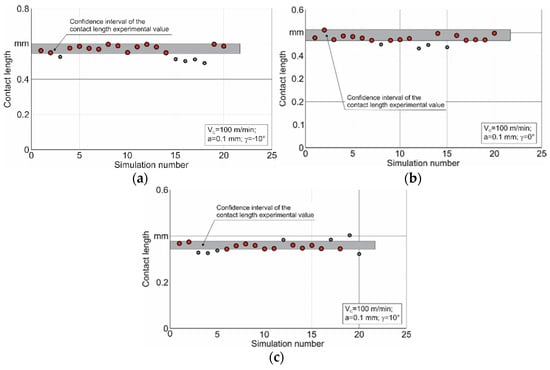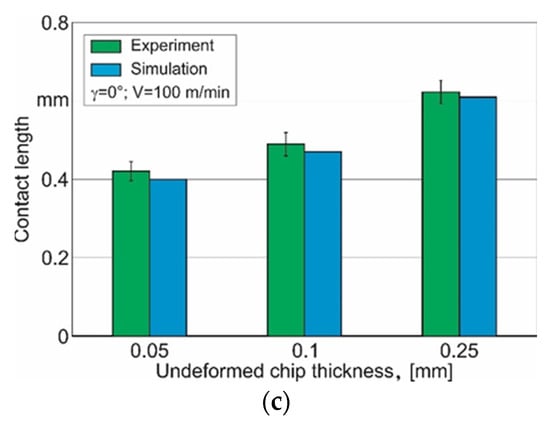 The largest deviation of the simulated contact length from its experimental value at different cutting speeds was 12% and is observed at a cutting speed of 150 m/min—Figure 7a. For the other examined values of cutting speed, the deviation of the simulated contact length from its experimental value does not exceed 9%. Therefore, a significant increase in the cutting speed leads to an increase in the deviation of the simulated contact length values from its experimental value. The further increase in the cutting speed and transition to high-speed cutting is expected to lead to a significant deviation between the simulated and the experimentally determined contact length values. This is most likely due to the fact that the stress–strain state of the machined material in all the cutting zones and, in particular, in the secondary cutting zone is predominantly influenced by the cutting temperature. Increasing the cutting temperature at high cutting speeds leads to higher degrees of machined material softening and, thus, reduces the simulated contact length between the tool rake face and the chip. The difference in the simulated and experimental values of the contact length at different tool rake angles is approximately the same and does not exceed 4%—Figure 7b. The largest difference between the simulated contact length and its experimental value when changing the cutting depth is 4.3% and is observed at a cutting depth of 0.05 mm—Figure 7c.