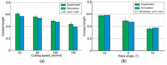 Cutting is one of the most common processes for forming various products. The cutting process is manifested externally by different physical quantities that can characterize the process. The most important characteristics of the cutting process are the thermomechanical properties of the process, such as the forces and temperatures, the chip morphology, and the chip compression value, as well as the micro-geometry and the physical–mechanical parameters of the machined material surface. The cutting process is externally expressed by various physical quantities that can characterize the process. The most important characteristics of the cutting process are the thermomechanical properties [1,2,3], such as the forces and temperatures, the chip morphology, and the chip compression value, as well as the micro-geometry and the physical–mechanical parameters of the machined material surface. These quantities are generally used to determine the state of the cutting process. In addition to the properties of the technological system that realize the cutting process, the contact parameters between the tool, chip and workpiece also define the cutting process. An important contact characteristic is the contact length between the rake face of the tool and the chip, which determines the interaction in the secondary cutting zone, e.g., the friction and heat transfer between the tool and the chip. The contact length has a complex relationship with the parameters and conditions of the cutting process, the thermomechanical properties of the machined material, the cutting tool geometry, and others. Due to the complexity of these relationships, it is not yet possible to analytically determine the contact length between the rake face of the tool and the chip. Simultaneously, the contact length is used as a reference value in many analytical cutting models; see, e.g., [1,4,5]. Furthermore, the contact length is used as a verification value of simulation results for the numerical cutting models. It can serve as a reference point for evaluating the correct selection of parameters of the constitutive equation and the parameters of the friction model for use in the numerical cutting models. Determining the contact length between the rake face of the tool and the chip is, therefore, an important issue, and solving it will improve the accuracy and validity of the modeling results of various cutting processes. This paper deals with experimental and simulative studies to determine the contact length for further use in analytical and numerical cutting models.