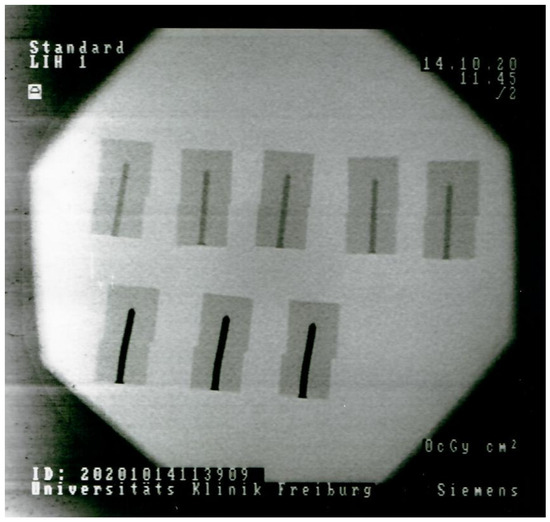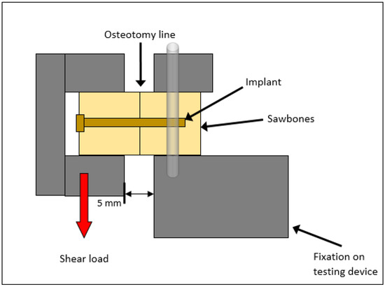 For quasi-static testing, displacement-controlled static tests were performed at a rate of 5 mm/min. The measurement was stopped at the fracture of the sample, which was defined as a shear of 2 mm (with x ≥ 2 mm). Load (N) and displacement (mm) were recorded with 1000 values per second and force-displacement curves were drawn from the data using Origin Pro 2020 (OriginLab, Northampton, MA, USA). Ultimate load () was determined from the load versus displacement plot. After the fracture, radiographs of the specimens were taken with the X-ray unit Siremobil-ISO C from Siemens (Siemens AG, Munich, Germany) to determine and document the nature of the failure.