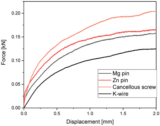 This figure shows the average force-displacement curves of the MAGNEZIX pin, the zinc pin, the cancellous screw, and the K-wire under quasi-static load.