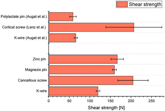 The mean maximum shear strength of the K-wires in the measurements in 20 PCF Sawbones conducted by us was 119.96 N. Augat et al. [5] reported a maximum shear strength of only 66 N for NaCl-conditioned K-wires placed in 20 PCF Sawbones (see Figure 4). Thus, the K-wire connections measured by us showed a greater shear strength. This may be due to the fact that the implants were inserted with different techniques. For example, Downey et al. [42] showed in shear tests with Sawbones with 15 PCF and cancellous screws that the maximum shear strength can be changed by different pre-drilling techniques. Augat et al. [5] did not describe the technique used to insert the K-wires in detail. In our experiments, the Sawbones for the K-wires were not pre-drilled, but the K-wires were inserted directly vertically into the synthetic bones at a low speed of 135 rpm. Another explanation lies in a difference of the acting forces due to a difference in the lever arms. Seebeck et al. [43] showed that the maximum shear strength decreased with a longer lever arm.