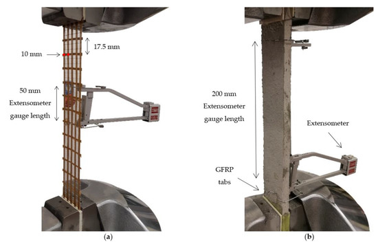 Figure 1b shows the clamping-grip tensile test configuration adopted for the PBO FRCM specimens. Tests were conducted in displacement control at a stroke rate of 0.2 mm/min during the uncracked phase and of 0.5 mm/min during the cracked phase, according to the indications of [21]. A servo-hydraulic testing machine with hydraulic wedge grips was employed for the test. The machine wedge pressure was set to provide adequate gripping for the specimen and to prevent textile slippage within the clamped length. The coupon ends were equipped with GFRP tabs with dimensions 80 mm × 50 mm × 2 mm to promote an even distribution of the clamping pressure and prevent mortar failure within the wedges. As a result, the specimen free length, i.e., excluding the clamped portions, was equal to L0 = 240 mm. A 200 mm-gauge length extensometer was adopted for the strain reading along the central portion of the specimen (Figure 1b).