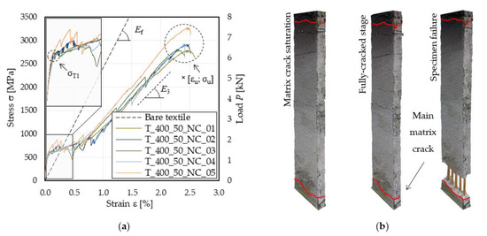 Clamping-grip tensile tests: (a) stress (load)–strain curves; (b) test of specimen T_400_50_NC_04: matrix cracks outside the extensometer gauge length are marked in red.