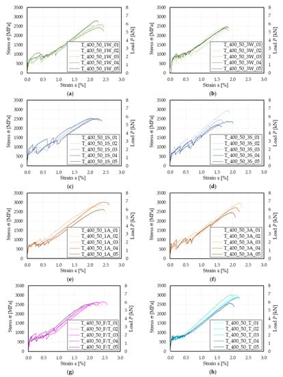 Specimens were named according to the notation T_400_50_XC_n, where T (= tensile) is the test method, 400 and 50 are the specimen length and width in mm, respectively, XC indicates the conditioning method, where X (if present) refers to the exposure duration (X = 1 stands for 1000 h and X = 3 for 3000 h), C is the environmental exposure type (NC = control, W = hygrothermal, S = saline, A = alkaline, F/T = freeze–thaw cycles, T = dry-heat), and n is the specimen number.
