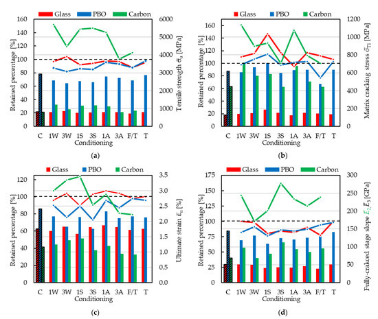 In this section, the results obtained from the PBO FRCM are compared with those of a carbon and an alkali-resistant (AR) glass FRCM reported in Sections 2.1 and 2.3, respectively. All composites considered were subjected to the same conditioning protocols described in Section 3. The results of SRG provided in Section 2.4 are not included in this comparison since they were obtained with different conditionings. Figure 4 compares the average tensile strength (Figure 4a), matrix cracking stress (Figure 4b), ultimate strain (Figure 4c), and slope of the fully cracked stage (Figure 4d) after the exposures (histogram bars) and the corresponding percentages of retained performances with respect to control specimens (line charts). Average values were computed from groups of five specimens per conditioning and are reported in Table 4 and Table 5 for carbon [34,47] and AR glass [38] FRCMs. Values provided for the PBO FRCM were those presented in this paper. It should be noted that carbon, AR glass, and PBO FRCMs employed a cement-based matrix. However, tensile tests on PBO and AR glass FRCMs were performed using the clamping-grip set-up [21], whereas the clevis-grip set-up was employed for the carbon FRCM [20]. Accordingly, the average slope of the fully cracked stage of carbon FRCM specimens, which is named cracked elastic modulus in ACI 549 [24,25], is indicated with the symbol in Figure 4d and Table 4. Furthermore, carbon FRCM specimens were not exposed to dry-heat conditions (column T = maximum service temperature in Figure 4).
