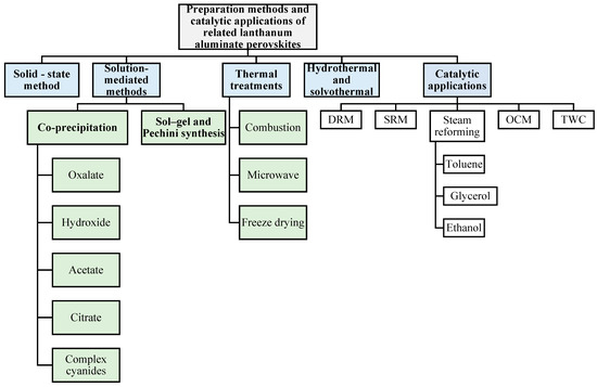 | LaAlO3 with 25% molar Al substitution by Co, Cu or Ga | Citrate sol–gel | 30 | 700 | [71] |