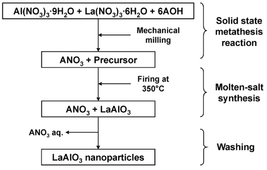 - Wang, Z.; Wu, W.; Bian, X.; Wu, Y. Low temperature green synthesis of LaAlO3 using microcrystalline LaOCl and amorphous Al2O3 precursors derived from spray pyrolysis. Green Process. Synth. 2017, 6, 49–54. [Google Scholar] [CrossRef]