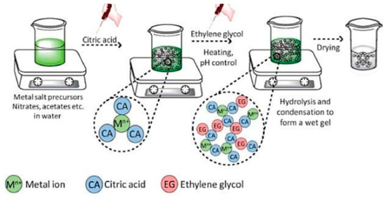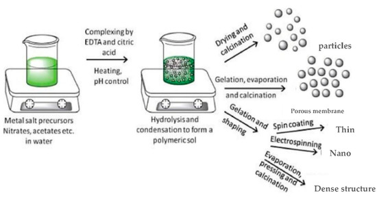 - Sunde, T.O.L.; Grande, T.; Einarsrud, M.A. Modified pechini synthesis of oxide powders and thin films. In Handbook of Sol-Gel Science and Technology; Springer: Cham, Switzerland, 2016; Volume 373, pp. 1–30. [Google Scholar] [CrossRef] [Green Version]