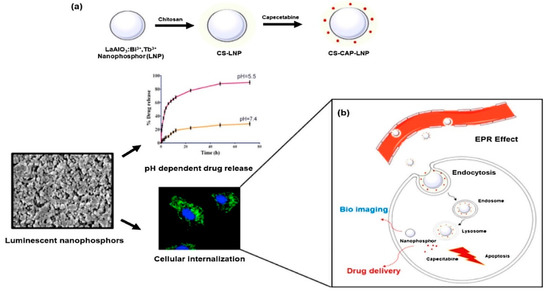 - Shaik, E.B.; Pindiprolu, S.K.S.S.; Phanikumar, C.S.; Samuel, T.; Kumar, B.V.N.; Santhoshi, P.M.; Reddy, P.V.S.S.S.N.; Kumar B, P.; Ramachandra, R.K. Optical emissions of chitosan modified LaAlO3: Bi3+, Tb3+ nanoparticles for bio labeling and drug delivery to breast cancer cells. Opt. Mater. 2020, 107, 110162. [Google Scholar] [CrossRef]