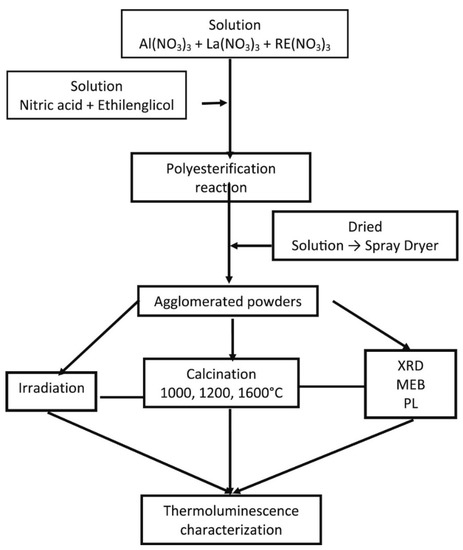 - Rivera-Montalvo, T.; Morales-Hernandez, A.; Barrera-Angeles, A.A.; Alvarez-Romero, R.; Falcony, C.; Zarate-Medina, J. Modified Pechini’s method to prepare LaAlO3:RE thermoluminescent materials. Radiat. Phys. Chem. 2017, 140, 68–73. [Google Scholar] [CrossRef]