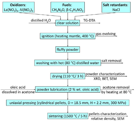 - Ianoş, R.; Lazǎu, R.; Borcǎnescu, S.; Bǎbuèǎ, R. Single-step combustion synthesis of LaAlO3 powders and their sintering behavior. Ceram. Int. 2014, 40, 7561–7565. [Google Scholar] [CrossRef]
