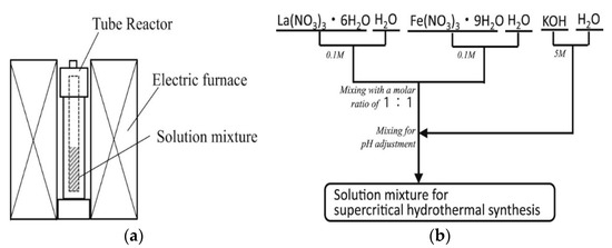 - Abe, Y.; Satou, I.; Aida, T.; Adschiri, T. Formation of La-based perovskite compounds in supercritical water. Ceram. Int. 2018, 44, 12996–13003. [Google Scholar] [CrossRef]