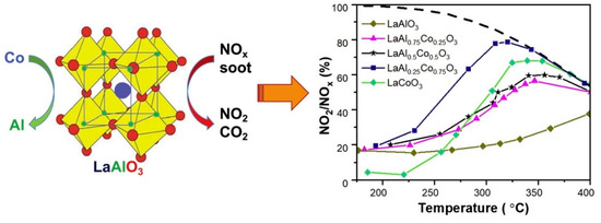 - Tran, Q.N.; Martinovic, F.; Ceretti, M.; Esposito, S.; Bonelli, B.; Paulus, W.; Di Renzo, F.; Deorsola, F.A.; Bensaid, S.; Pirone, R. Co-doped LaAlO3 perovskite oxide for NOx-assisted soot oxidation. Appl. Catal. A Gen. 2020, 589, 117304. [Google Scholar] [CrossRef]